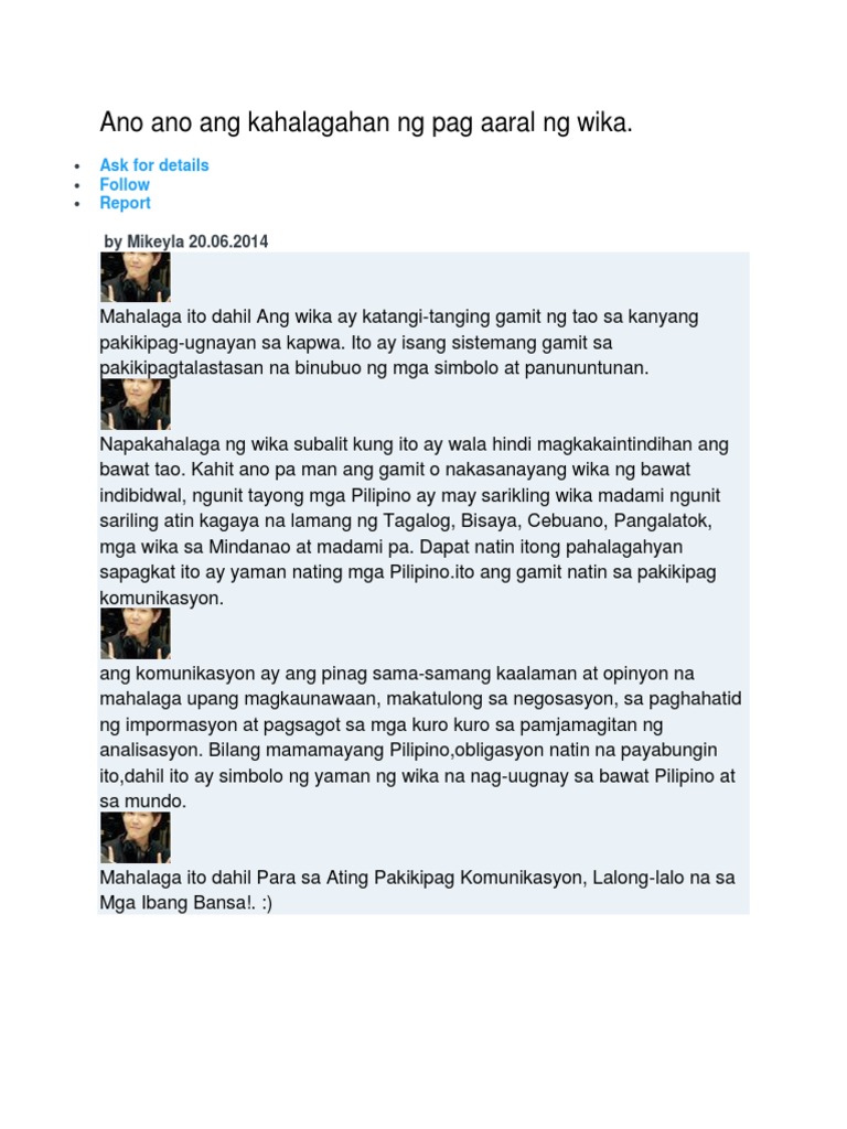 Ang wika ay mahalaga sa mga sumusunod na kadahilanan. Dipublikasikan oleh agrifs Sabtu 26 Juni 2021. Naglalaman ng pakikipagsapalaran ng mga tauhan.