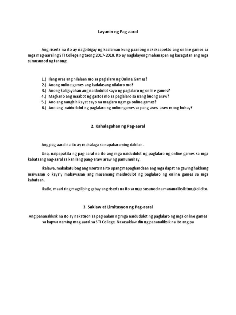 Saklaw at Limitasyon ng Pag aaral Ang pananaliksik na ito ay nakatuon sa paglalahad ng mga positibo at negatibong epekto ng social media sa mga estudyante ng ESEP sa Mataas na Paaralang Pambansa ng Sto. The generalmajor problem should be brief and with few but precise and clear sentences. Paglalahad ng Resulta ng Pananaliksik 1.