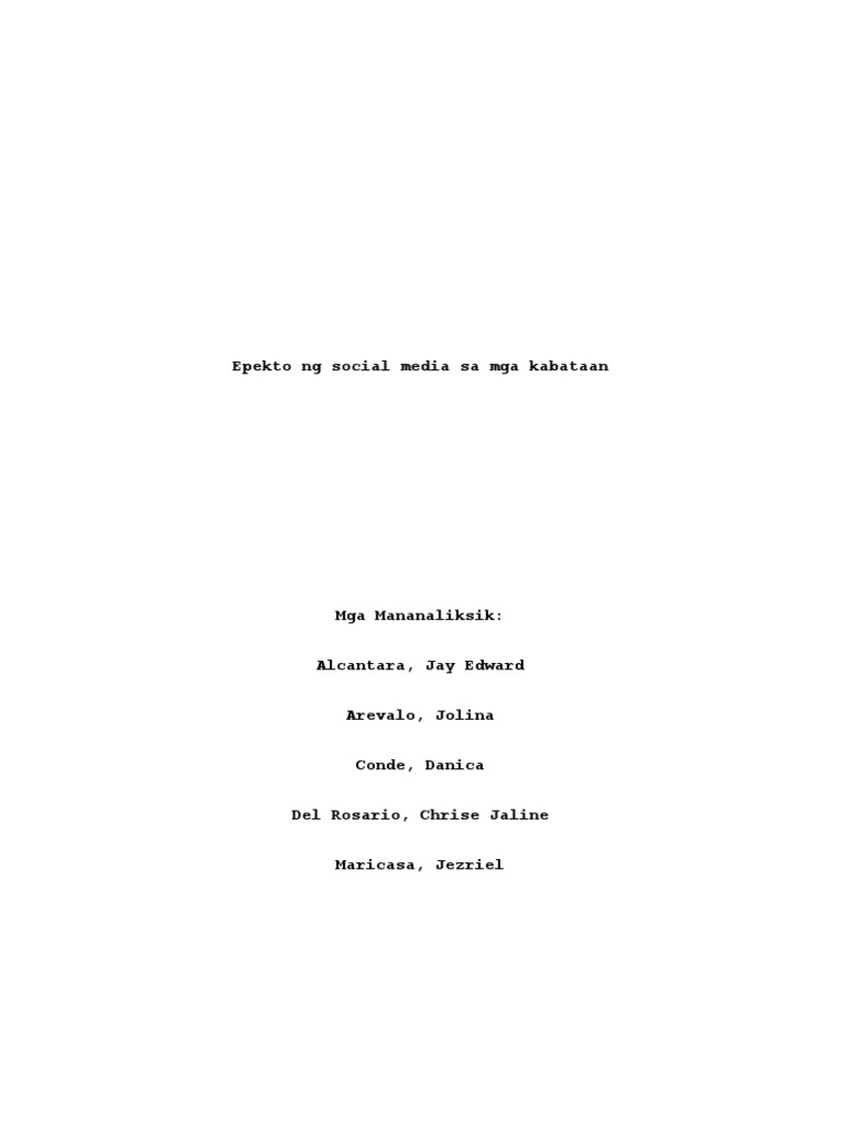 Kahapon kami ay inalipin ng tradisyonal na media lalo na. Ang karanasan ng mga estudyante ng social media ay limitado lamang sa mga tiyak na platapormasyong social media na ginagamit nila tulad ng Facebook Instagram Twitter at. Bilang pagtupad ng isa sa mga pangangailangan ng asignaturang Filipino 2 Pagbasa at Pagsulat Tungo sa Pananaliksik ang pamanahong papel na ito na pinamagatang Epekto ng Social Media sa Pag aaral ng mga Estudyante ng ESEP ng Mataas na Paaralang Pambansang StoDomingo ay inihanda at iniharap ng pangkat ng mga mananaliksik mula sa.