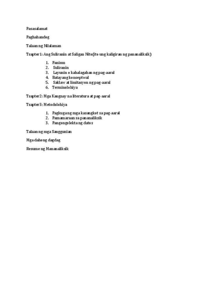 Anyo o uriKung pananaliksik pampanitikan kailangang tukuyin ang uri o genre ng susuriin sa pag-aaral maaari itong sanaysay tula dula at iba paPara sa pananaliksik sa ibang disiplina maaaring ito ang kalagayang panlipunan estruktura at iba pa. Panimula paglalahad ng suliranin layunin at kahalagahan ng pag-aaral saklaw ng pananaliksik at pagpapakahulugan ng termino. Mahalaga ang pananaliksik na ito dahil ito ay maaari itong maging gabay ng.
