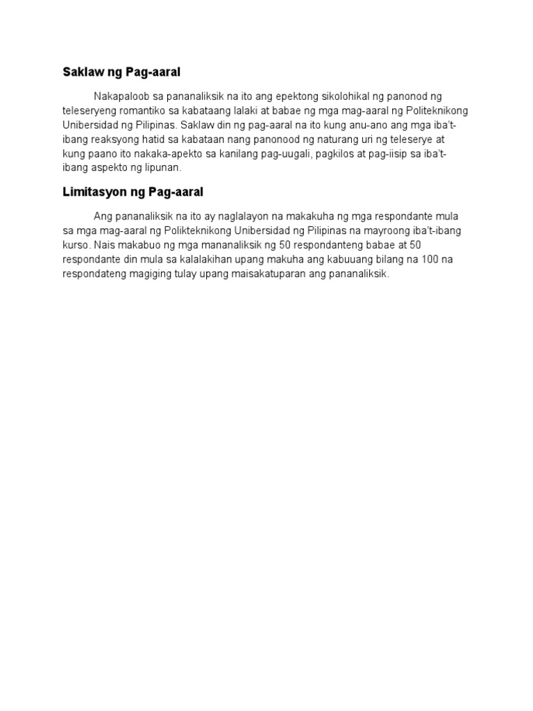 Ang limitasyon naman ay ang hangganan ng pananaliksik dahil hind naman lahat ay pwedeng aralin. 8 SAKLAW AT LIMITASYON NG PAG-AARAL Ang sakop ng aming pag-aaral ay ang unang taon na mag-aaral ng La Verdad Christian College- Caloocan. Nakapaloob sa pananaliksik na ito ang epektong sikolohikal ng panonod ng teleseryeng romantiko sa kabataang lalaki at babae ng mga mag-aaral ng Politeknikong Unibersidad ng Pilipinas.