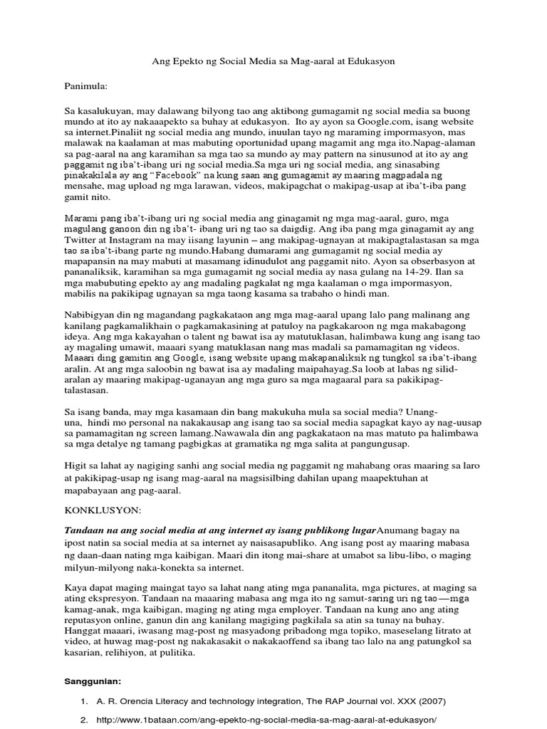 Sa panahon ngayon di na uso ang mga sulat na ipapadala sa ibang lugar ang uso ngayon ay ang tinatawag na internetAng internet. ANG EPEKTO NG SOCIAL MEDIA SA MAG-AARAL AT EDUKASYON. 2 pagbasa at pagsulat tungo sa pananaliksik ipinasa nina.